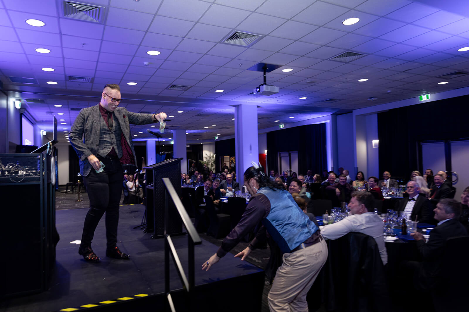 • Without Brendan, these two back-to-back conferences and award nights would not have been the roaring successes that they were. His humour, organisational skills, and insane magic kept the event flowing and the audience engaged. The event went from a little unsure to connected, enthused, and absolutely together. One attendee even grabbed the mic for an impromptu thank you followed by a standing ovation. We’ve already locked him in for next year before the event had even ended.